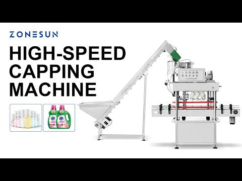 The ZONESUN ZS-FXZ101 Automatic High Speed Capping Machine with Cap Feeder is built for rapid and precise cap application in high-volume production. Featuring six rotary rubber wheels, it securely screws caps or lids onto bottles with consistent torque. The integrated cap feeder ensures a continuous supply of caps, minimizing downtime. With a capping speed of up to 8,000 bottles per hour, this machine is ideal for industries such as food, beverage, cosmetics, and pharmaceuticals that demand efficiency and reliability.