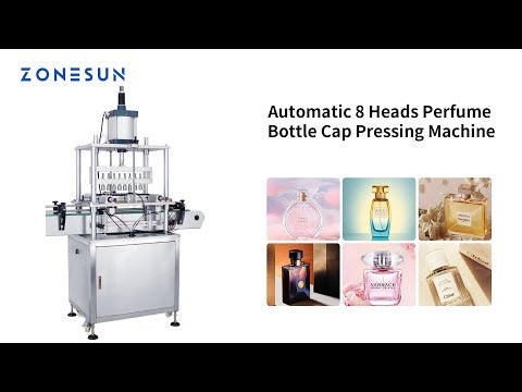 The ZONESUN ZS-YG10 Automatic Perfume Bottle Capping Machine features 8 capping heads for high-speed and precise sealing of perfume caps and collar rings. Equipped with a conveyor system, it can be integrated with filling and labeling machines to form a fully automated production line. Designed for efficiency and reliability, this machine is ideal for cosmetic, daily chemical, and fragrance industries. Whether you're sealing standard perfume caps or decorative collar rings, the ZS-YG10 ensures consistent and professional results.