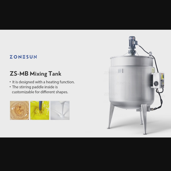 The ZONESUN ZS-MB1000L Stainless Steel Paste Heating & Mixing Tank is built from durable 304 stainless steel and features a heating function for efficient processing. Its stirring paddle can be customized in different shapes to suit various materials, making it ideal for mixing and emulsifying in the food, chemical, and cosmetics industries.