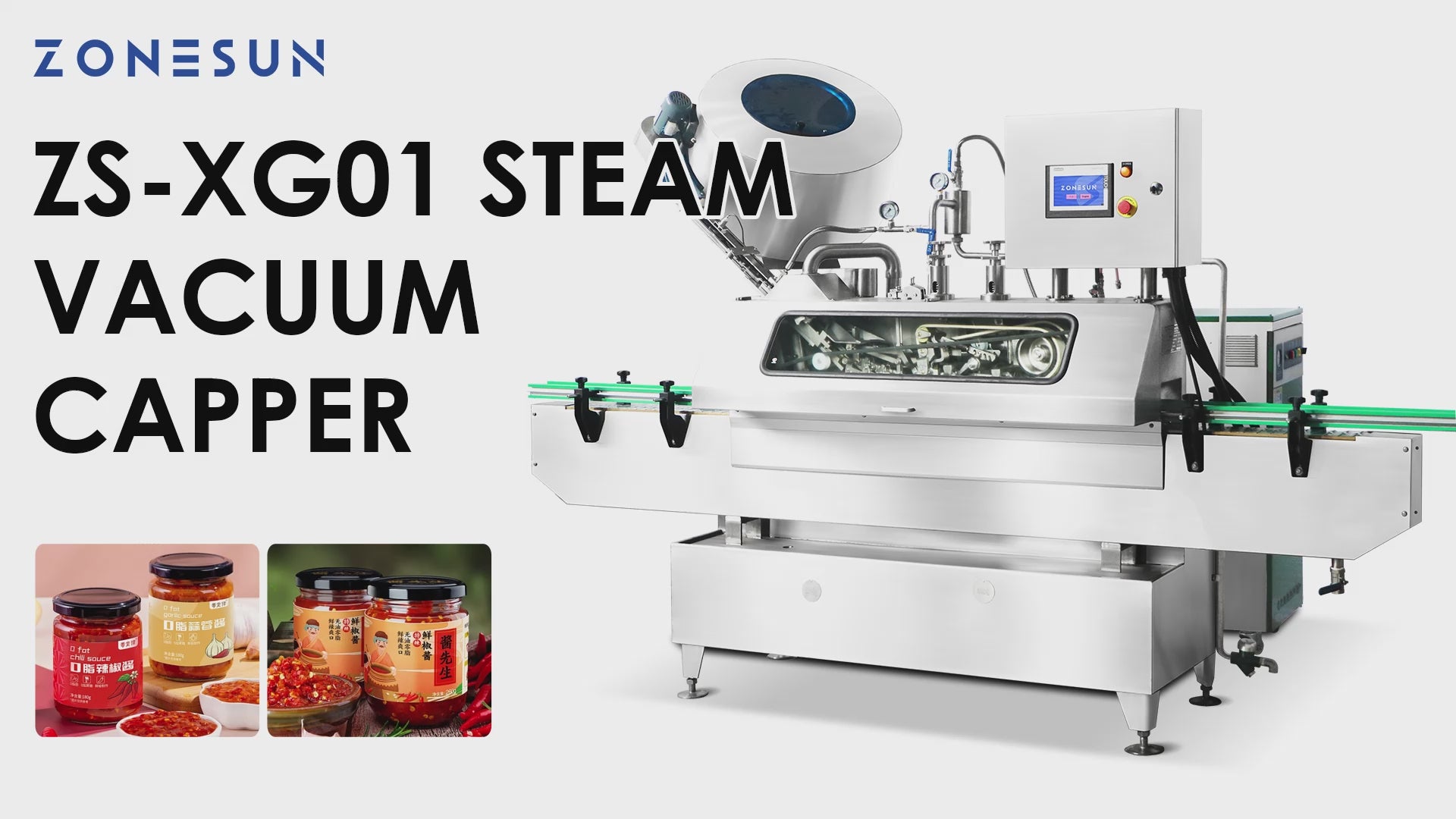 The ZONESUN ZS‑XG01 Steam Vacuum Capper is a high‑speed, fully automated sealing solution that combines steam injection and vacuum technology to deliver airtight, hygienic packaging for bottled products. Designed for twist‑off metal caps, it ensures a secure seal that preserves freshness and extends shelf life. With a production capacity of 4,800–9,000 bottles per hour, the ZS‑XG01 dramatically boosts productivity while maintaining consistent quality. Its automated process — from bottle infeed to steam application, vacuum sealing, and cap tightening — eliminates manual labor, reduces contamination risk, and guarantees professional, tamper‑resistant results. Ideal for food, beverage, and condiment manufacturers seeking reliable, high‑volume capping performance.